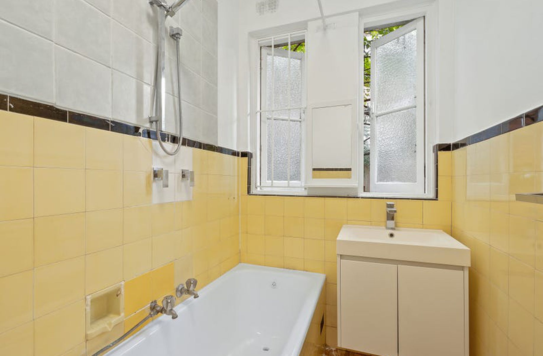 - Art Deco bathroom with bath/shower with the bath recently resurfaced