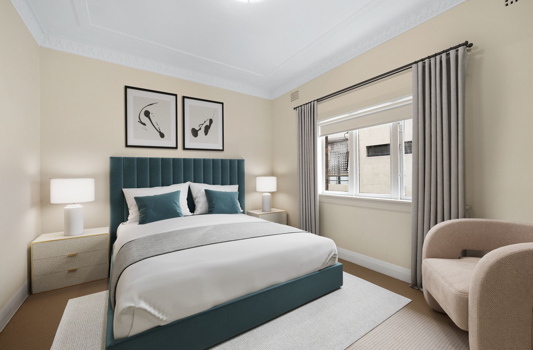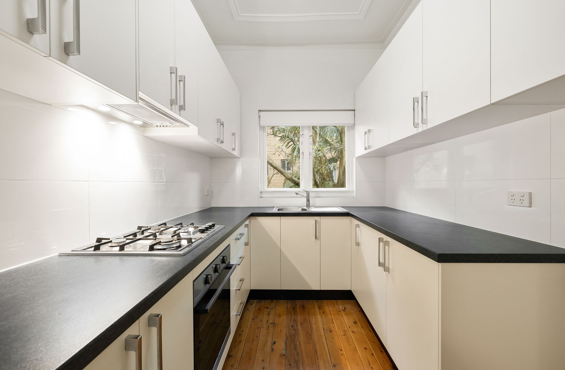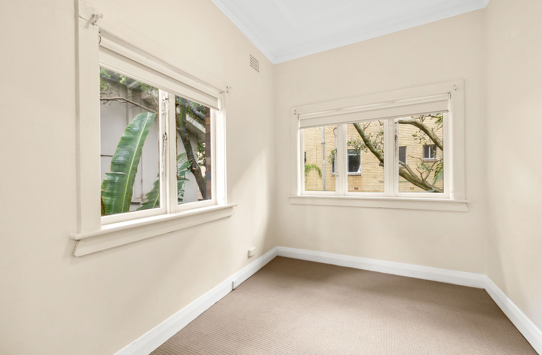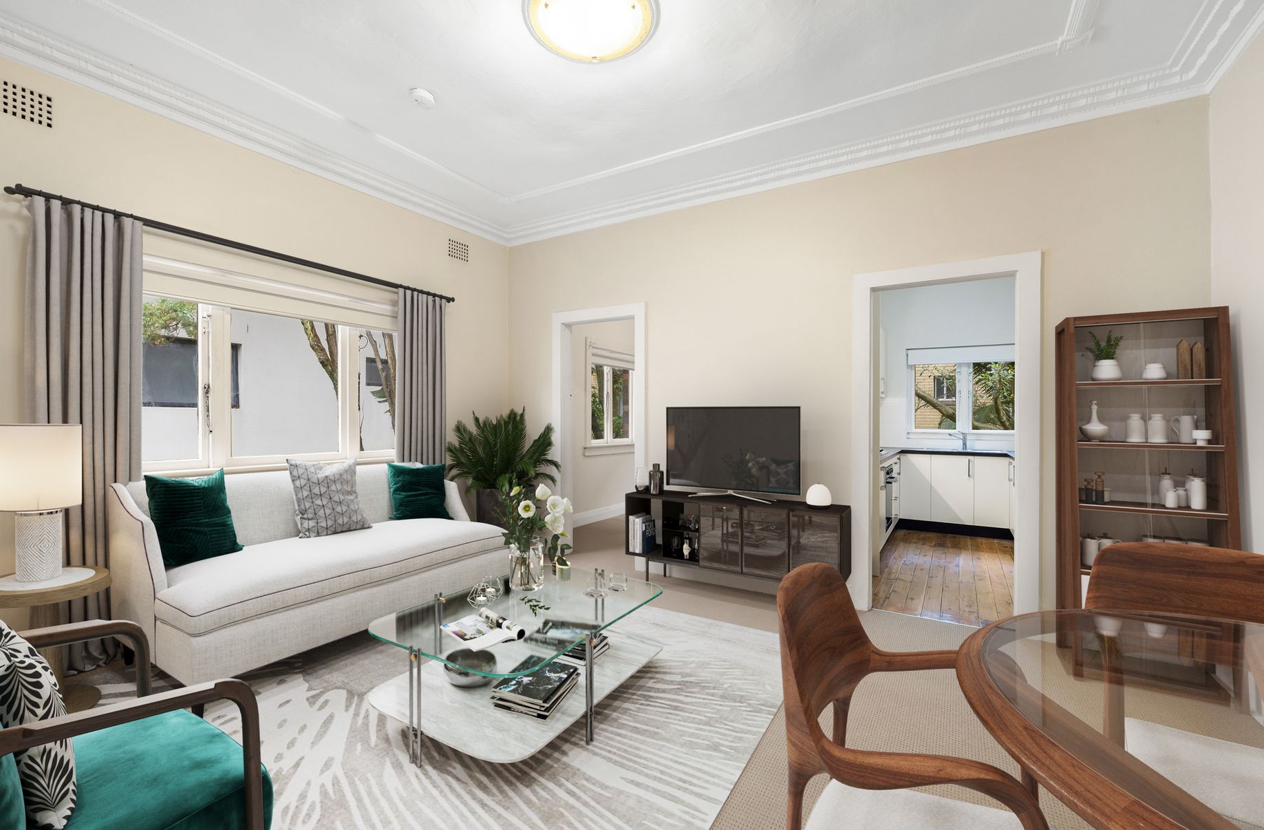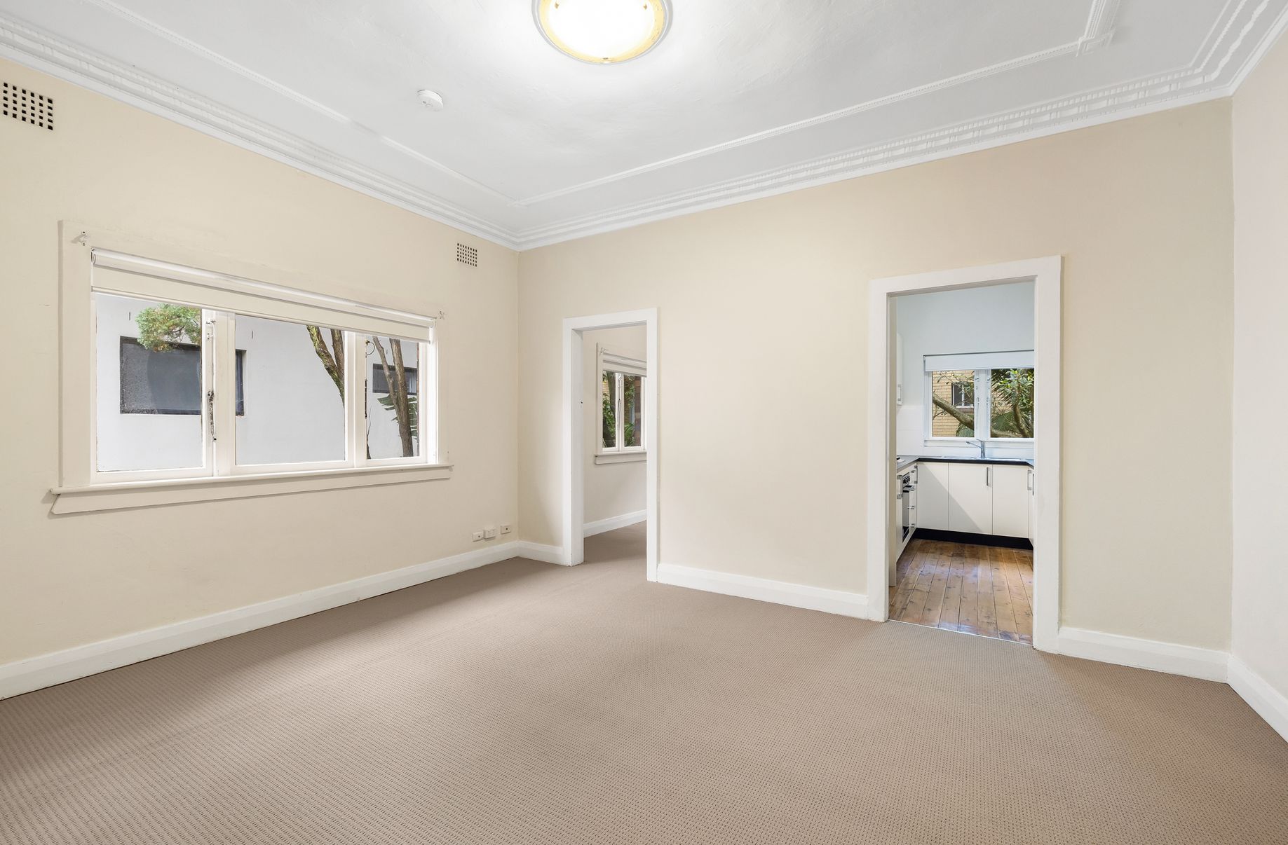 This semi-size, first-floor apartment is one of eight residential units set at the back of a quiet Art Deco security block.