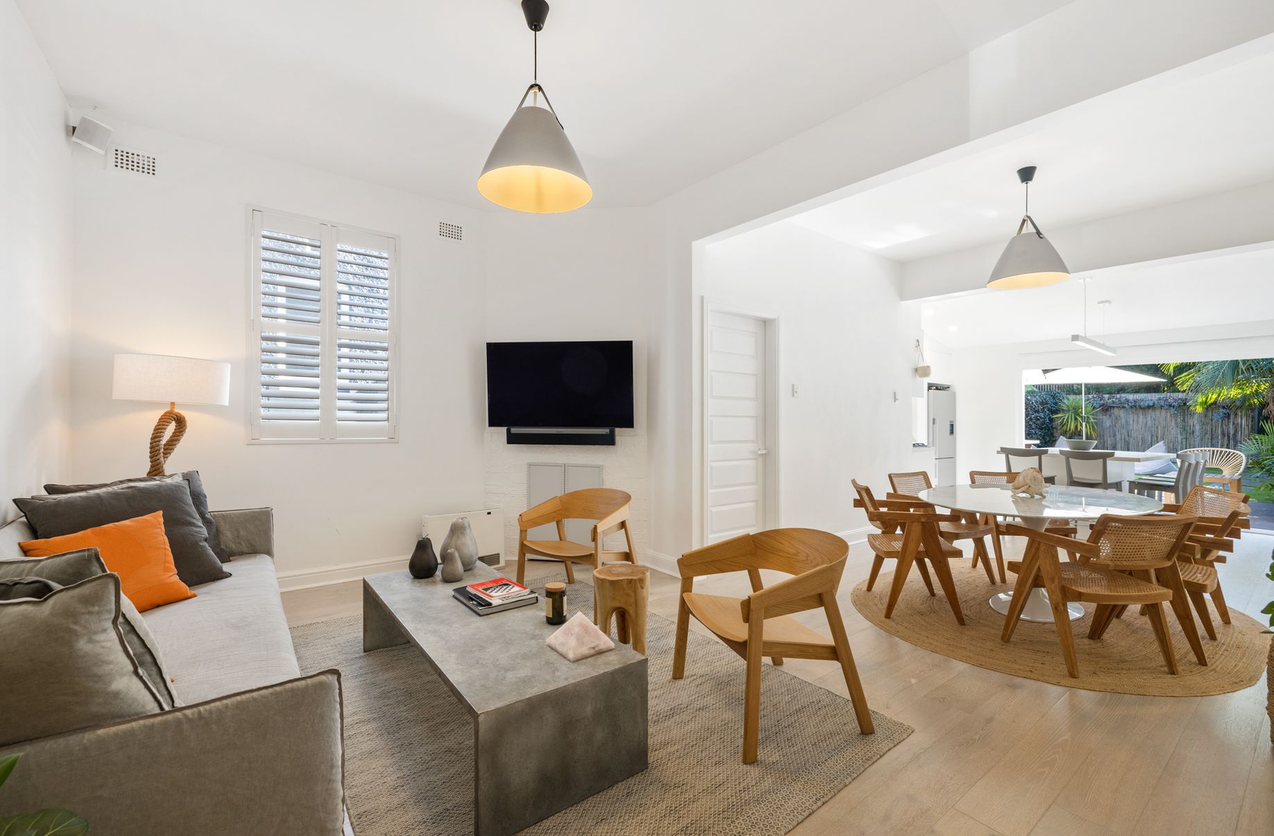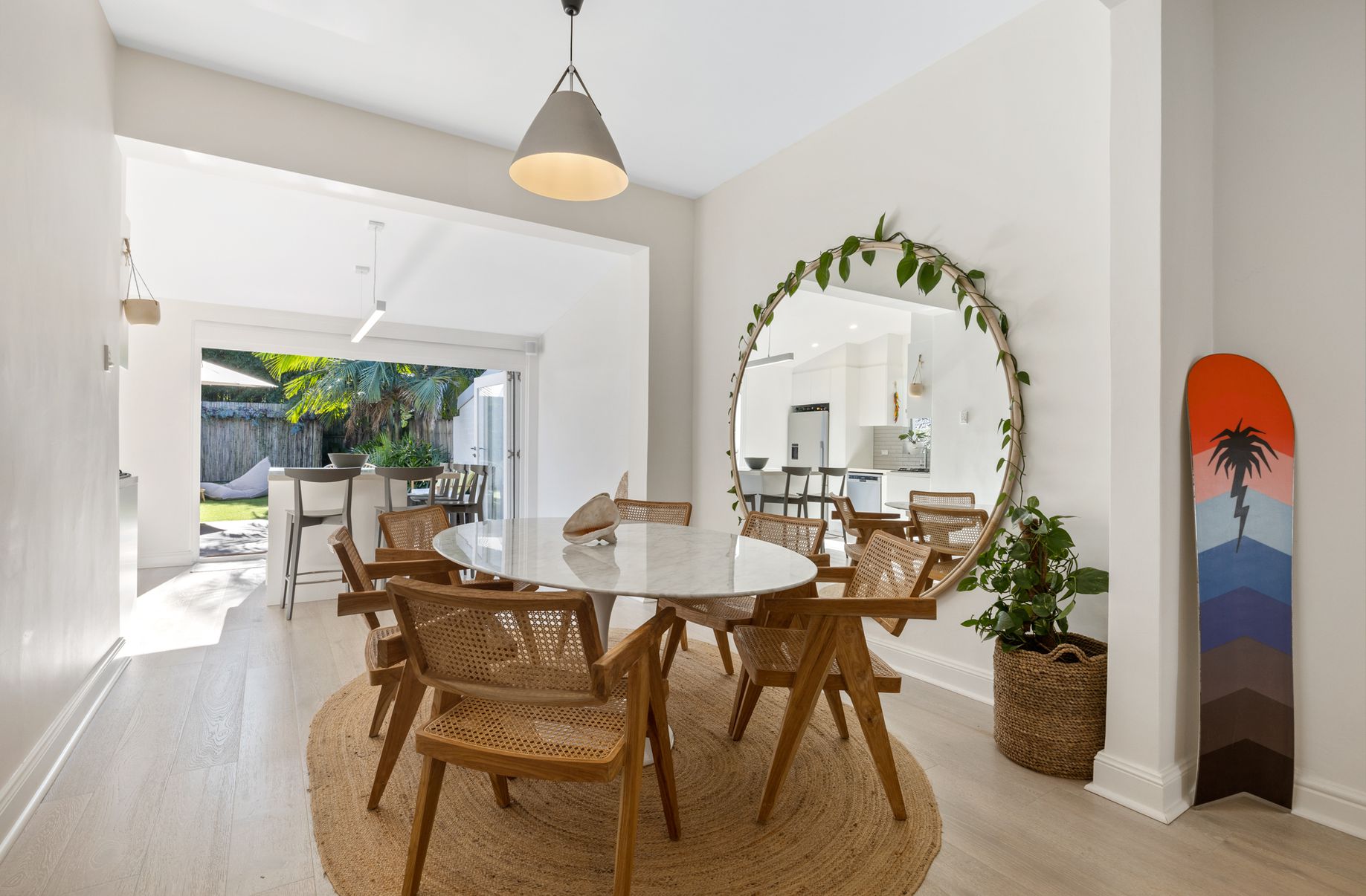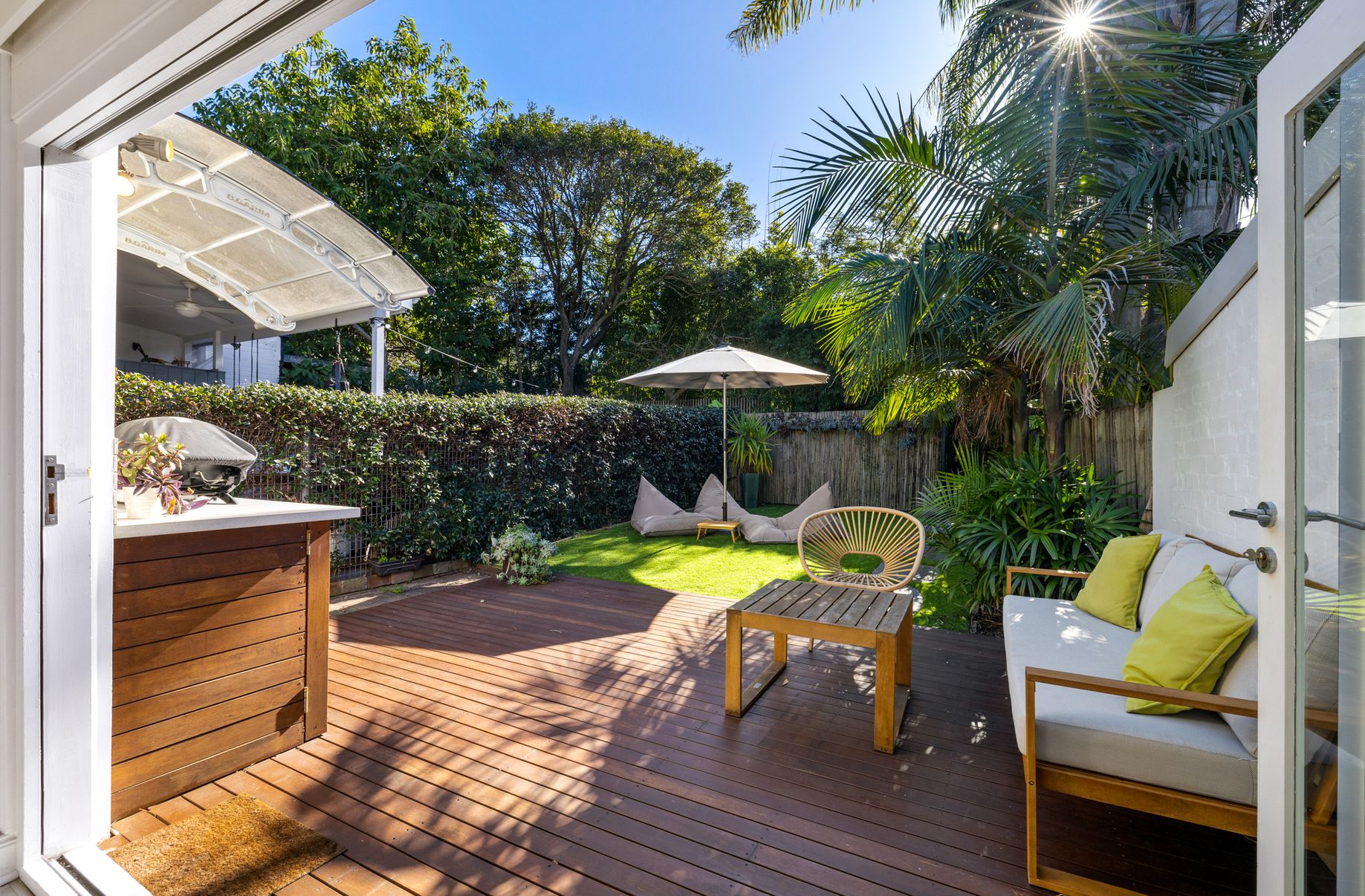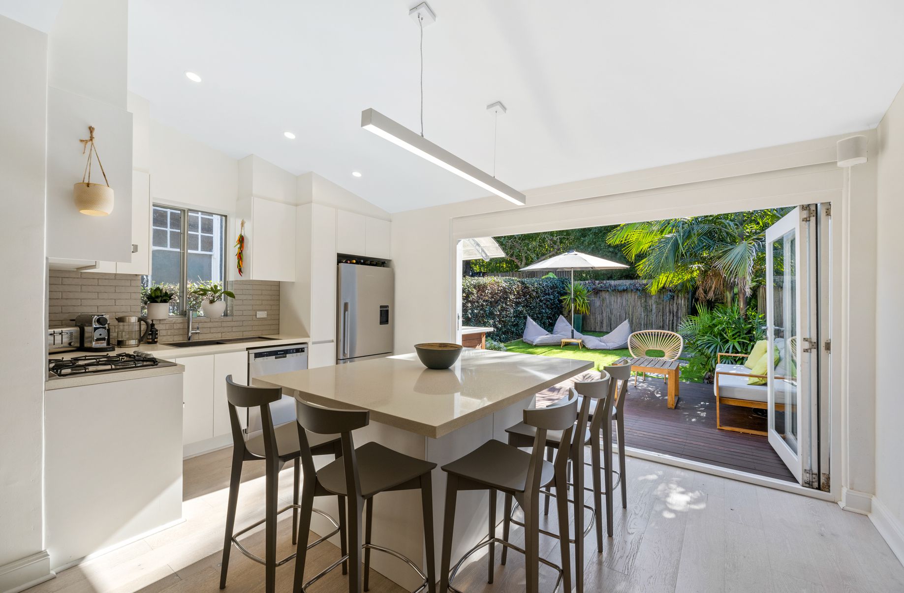 - Kitchen leads out to a sunny deck with a garden area, ideal for outdoor gatherings