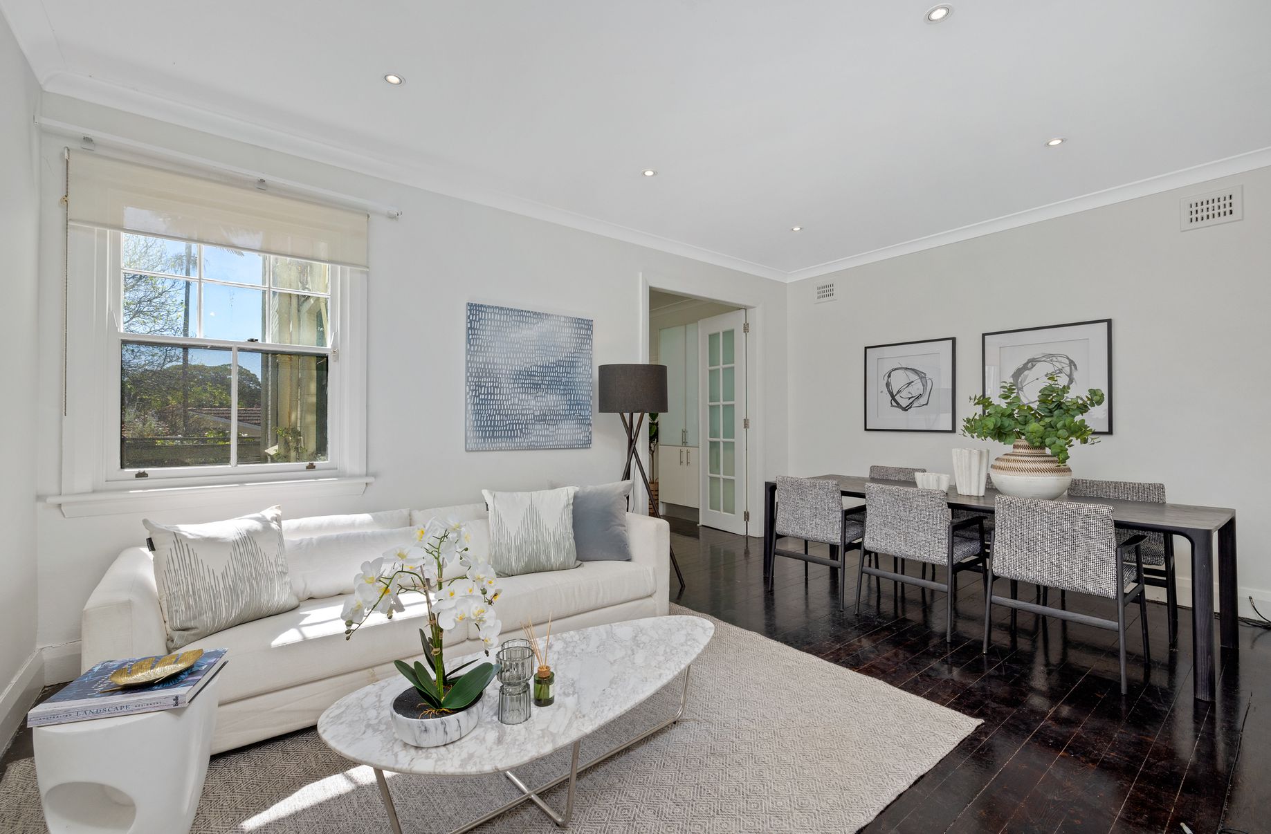 On the ground floor of its classical boutique block, this ground floor apartment reveals a beautiful fusion of old-world charm and tasteful contemporary updates. Offering the scale and feel of a semi-attached home, the apartment comes complete with its own private street entrance and rear access to a shared garden. Beautiful dark chocolate floorboards continue throughout, with lovely preserved details including high patterned ceilings and timber framework adding timeless touches. Wonderfully light-filled and tranquil, the apartment is tucked away in a leafy cul-de-sac setting with walk-everywhere convenience.