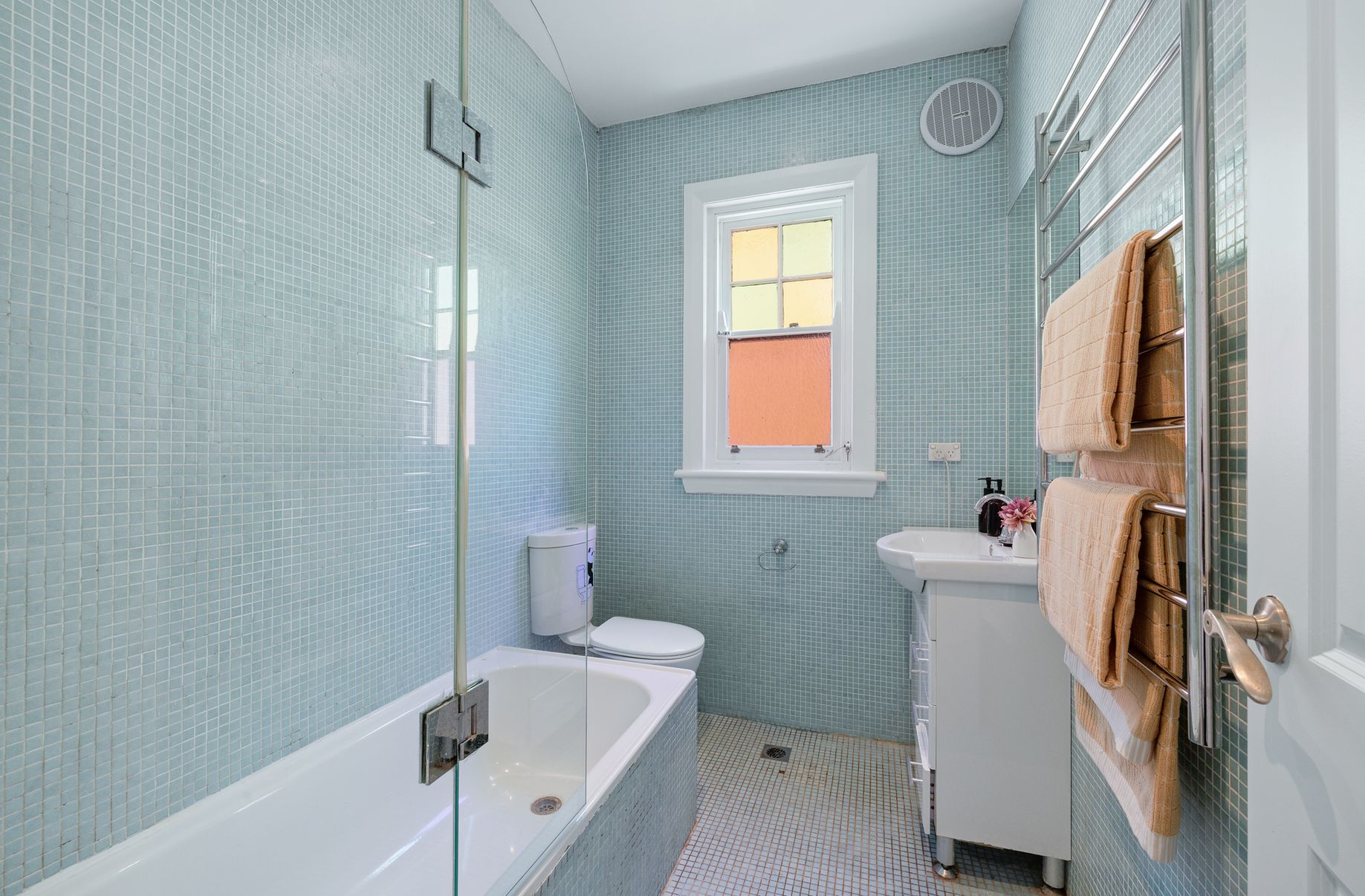 - Updated bathroom dressed in chic mosaics includes bath