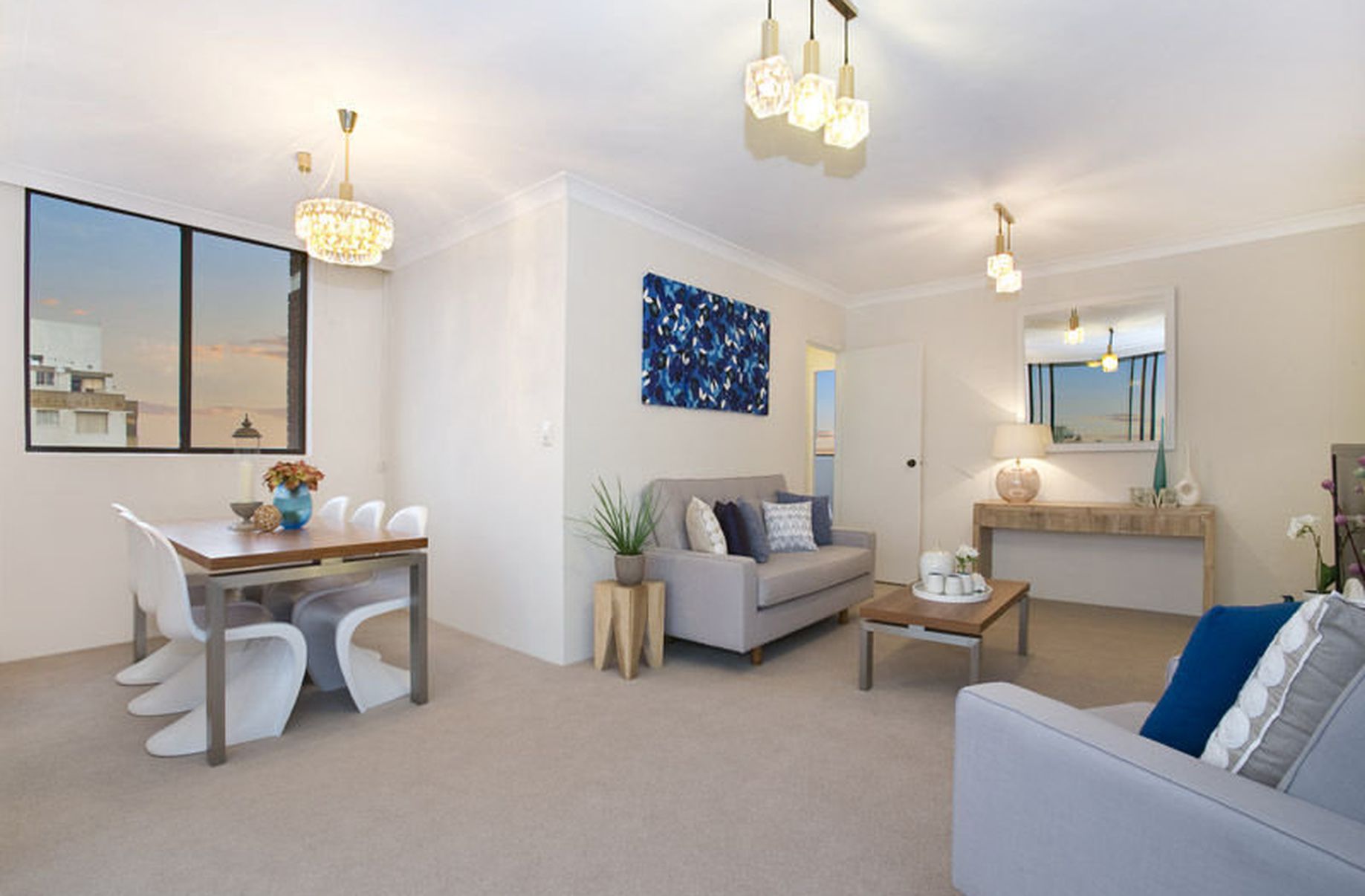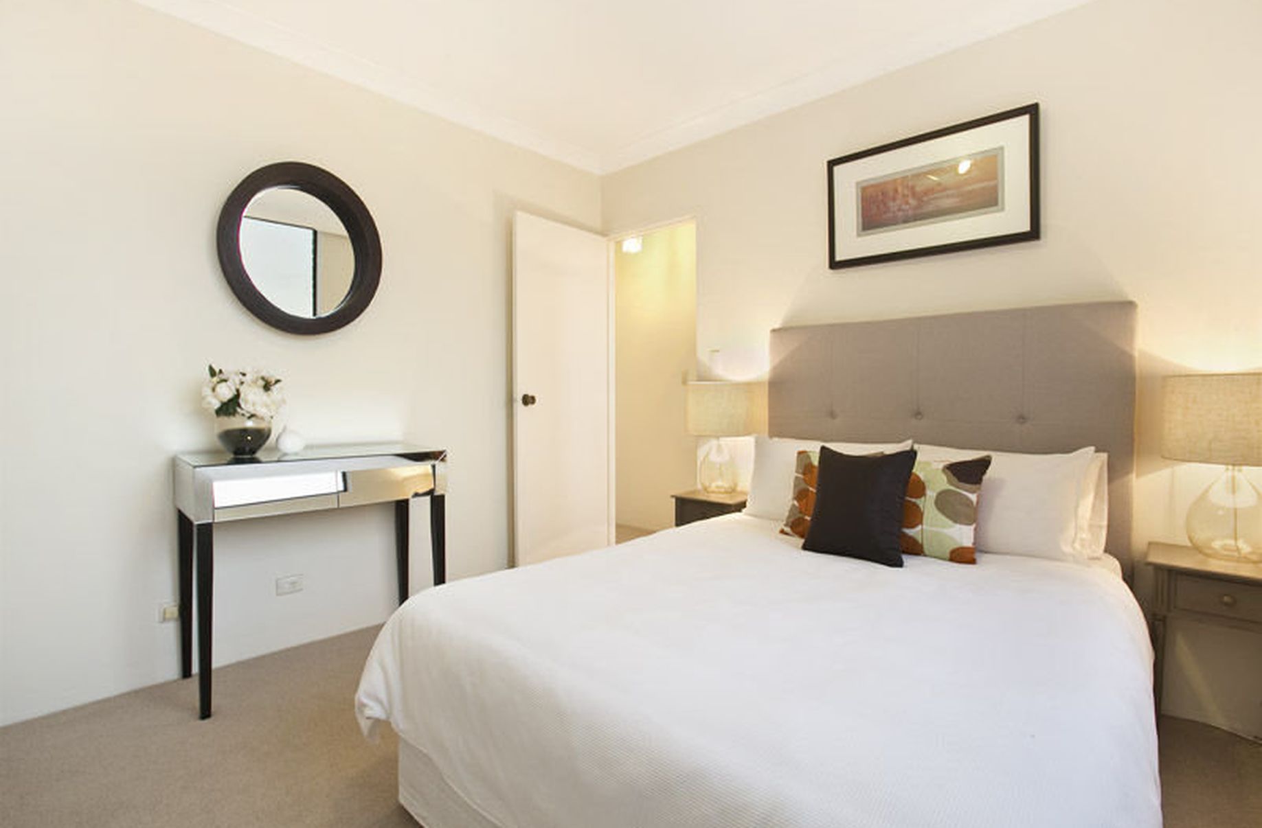 Newly carpeted with freshly painted interiors throughout, a large combined living and dining space opens to the balcony. It accommodates two double bedrooms with fitted built-in wardrobes. The master bedroom includes an ensuite and the main bathroom incorporates a separate bath.