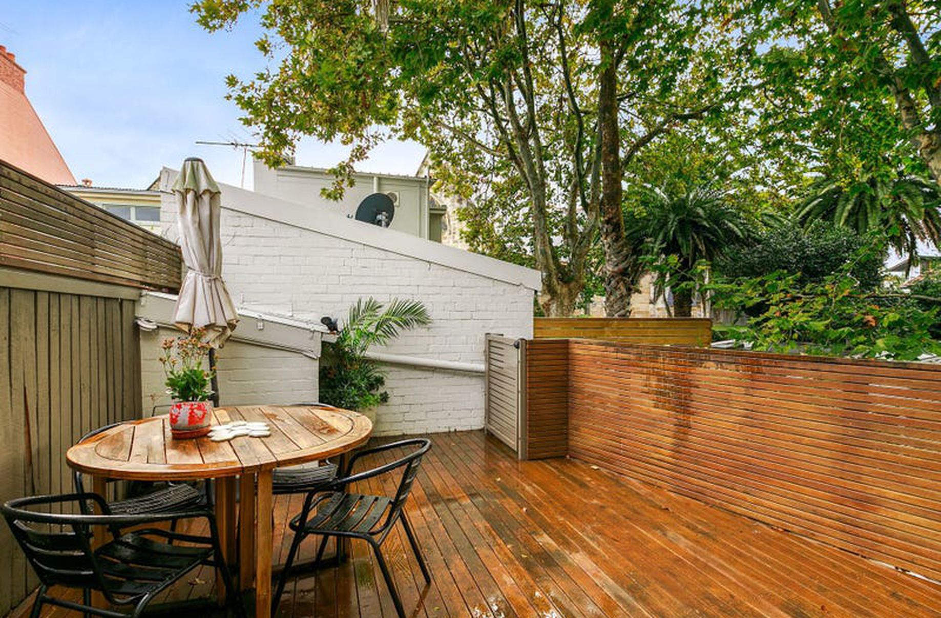 The deck is sunny, leafy and attracts some birdlife. It offers a pleasant outlook over the neighbourhood's historic terrace rooftops.