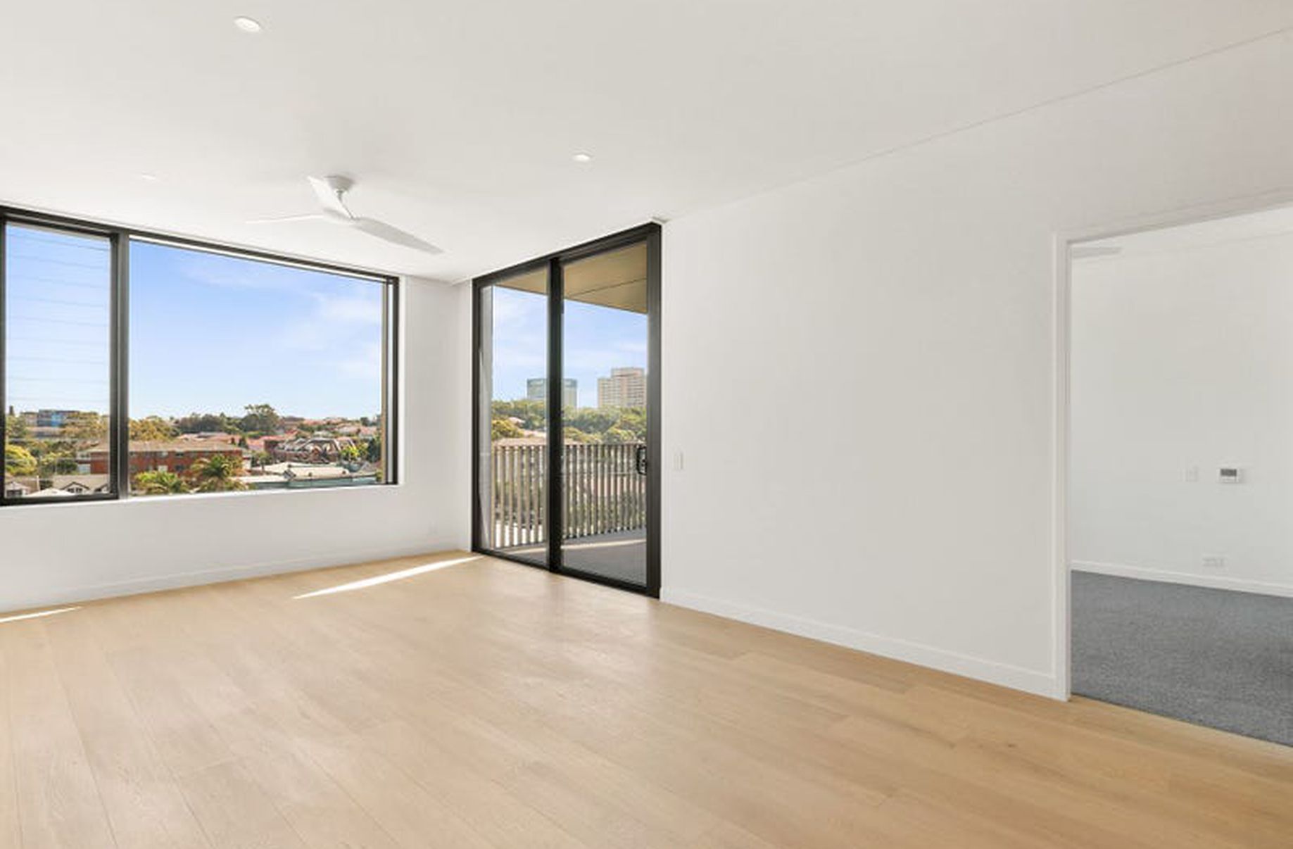 - Bright open plan living space with wide floorboards