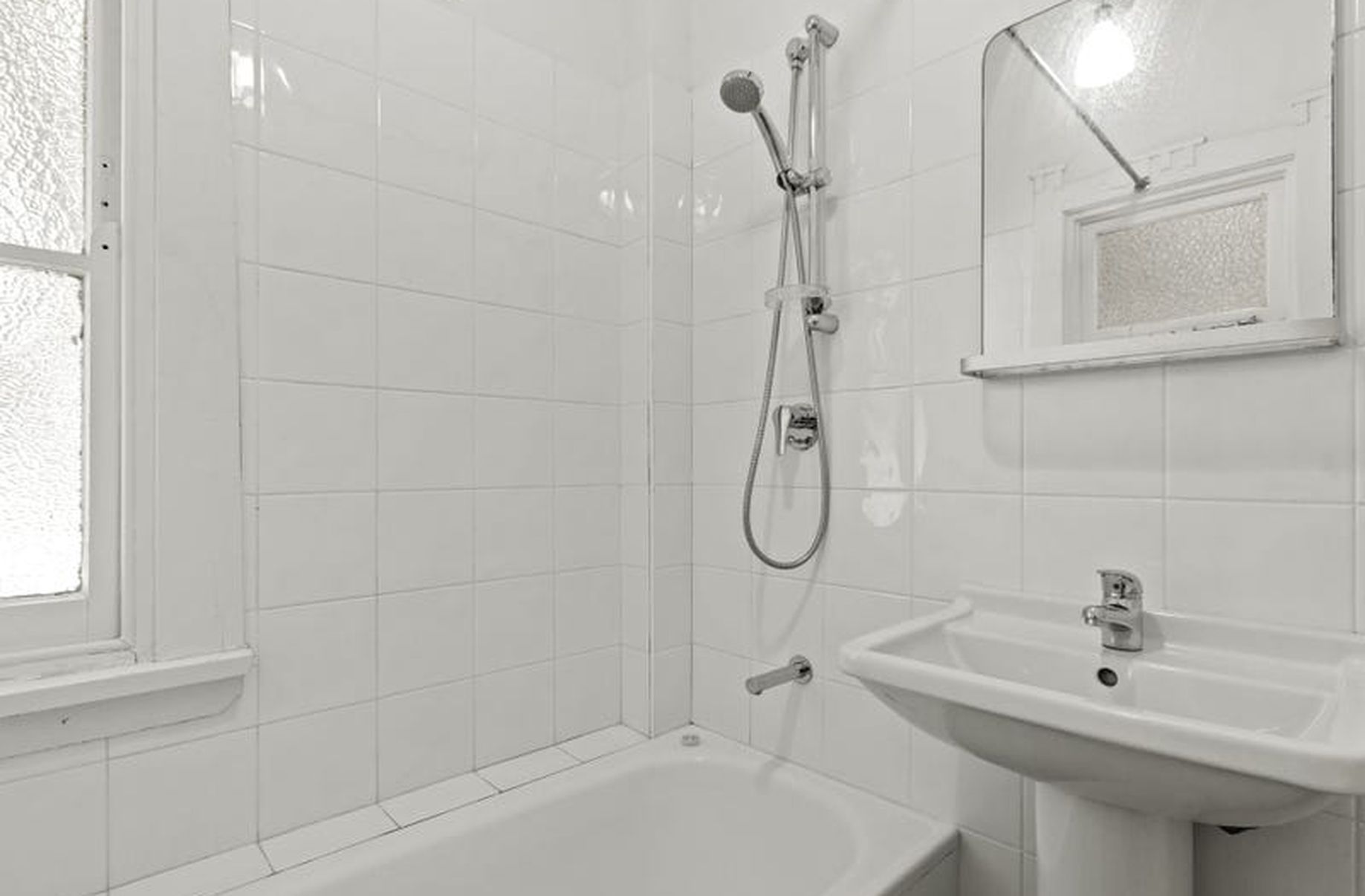 - Modern white-tiled bathroom with bath & shower
